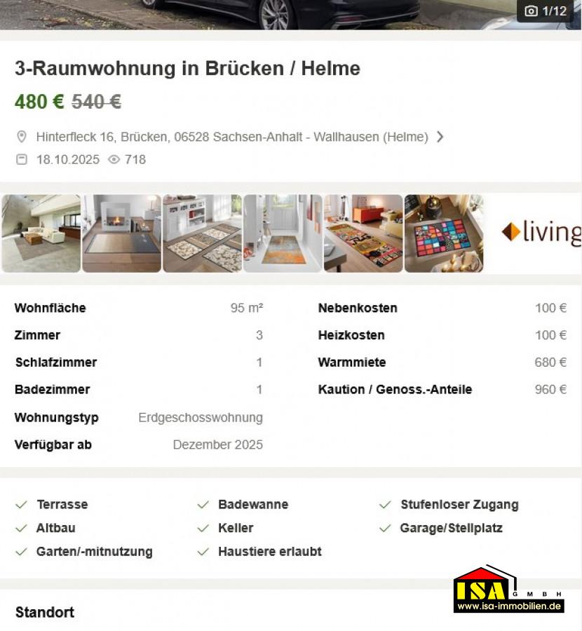 Die Wohnung befindet sich im Ortsteil Brücken der Gemeinde Wallhausen im Landkreis Mansfeld-Südharz. Die Lage ist ruhig und ländlich geprägt und bietet ein angenehmes Wohnumfeld mit viel Natur und Erholung. Wallhausen sowie die nahegelegene Kreisstadt Sangerhausen sind in wenigen Minuten mit dem Auto erreichbar und bieten eine gute Infrastruktur mit Einkaufsmöglichkeiten, Schulen, Kindergärten, Ärzten und weiteren Einrichtungen des täglichen Bedarfs. Die ruhige Straße Hinterfleck ist verkehrsarm und ideal für Familien, Paare oder Mieter, die ein entspanntes Wohnen im Grünen bevorzugen.